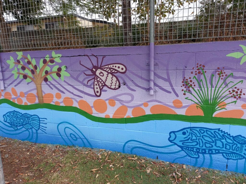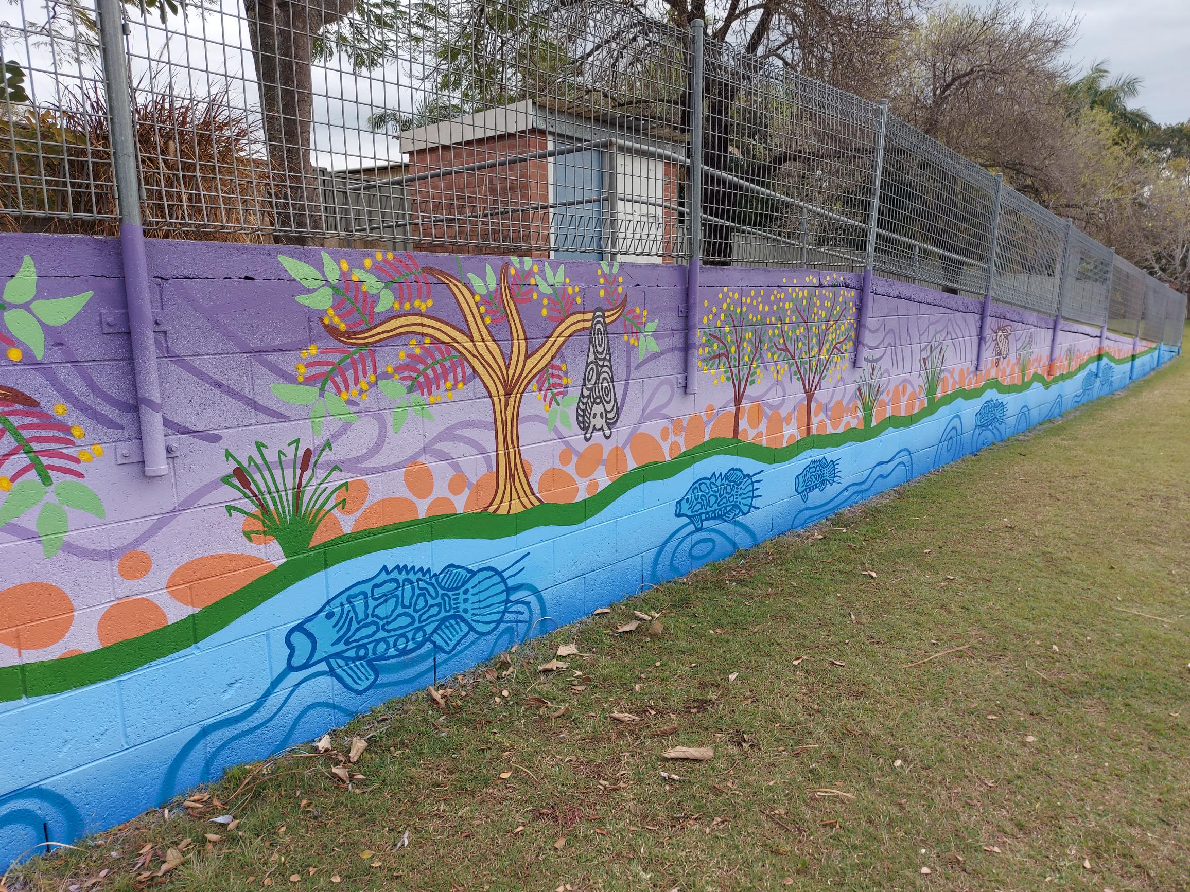 The background of the mural represents the landscape of South Grafton which is the Clarence River and the surrounding hills and mountains of the Gibraltar Range that is visible from the school. The artists chose colours that would complement the imagery on top of the landscape.